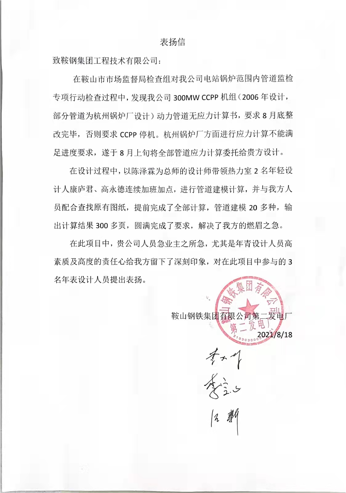 來自二發(fā)電的表揚(yáng)信